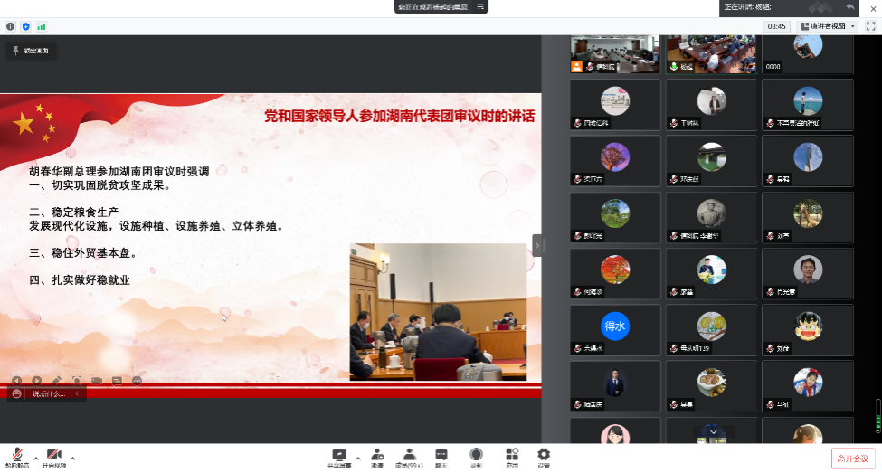 张琳教授从“大会概况及主要特点、习近平主席两会期间重要讲话精神、党和国家领导人参加湖南团审议时讲话精神、大会各项报告主要精神、湖南代表团履职情况、人大会议期间宣传报道情况”等六个方面对会议精神及相关情况进行传达和介绍。