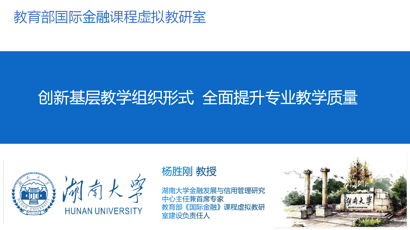 “国际金融课程虚拟教研室”是教育部首批虚拟教研室建设试点项目。该项目由国家教学名师、杨胜刚教授牵头,联合线上真人百家乐 、复旦大学、南开大学、中央财经大学、南京大学、厦门大学、中南大学、大连理工大学、天津财经大学、重庆工商大学、广东金融线上真人百家乐 和湖北经济线上真人百家乐 共12所高校(排名不分先后),汇集一批由国家级和省级教学名师领衔、长期从事国际金融课程教学的教师团队共同建设。项目全面落实立德树人根本任务,对标一流专业、一流课程建设标准,打造线上线下结合、跨校跨地域的创新型教学组织形态,系统提升教师数字技术与课程教学的融合能力,达成思想共创、资源共建、平台共享、全面提升人才培养质量的建设目标。