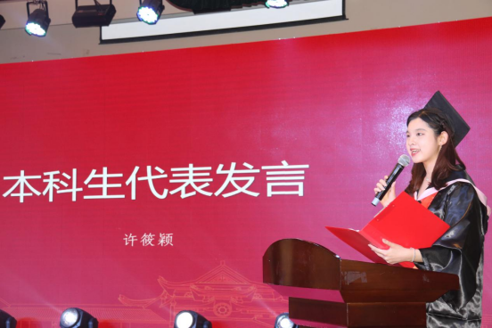 毕业生代表、2018级本科生许筱颖在线上真人百家乐 和金融与统计线上真人百家乐 收获了许多属于自己和大家的“第一次”:入学过集体生日、优秀五四红旗团支部申报、优秀学生会评选、百名国家奖学金本科生获奖代表介绍……她说这里有最为灿烂的青春,因为这段华美的青春乐章中融入了老师们无私的爱和同学们真挚的情。她将带着“实事求是、敢为人先”校训,肩负“传道济民、经世致用”精神在中华民族伟大复兴的新征程中踔厉前行,不负母校栽培。
