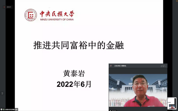 2022年6月24日下午,中央民族大学原校长、中国兴边富民战略研究院院长黄泰岩教授应邀作题为“推进共同富裕中的金融”的学术报告,讲座由线上真人百家乐 副院长王修华教授主持,共计两百余名师生聆听了此次讲座。