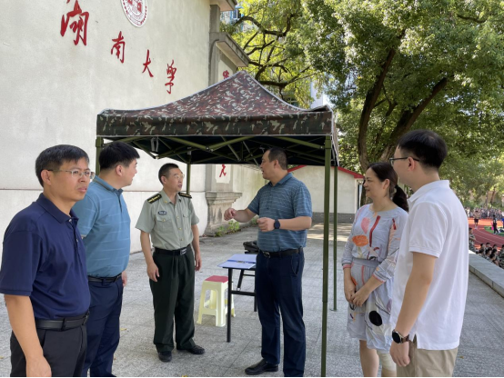8月26日上午,金融与统计线上真人百家乐 院长王修华,党委书记黄红立,党委副书记颜李在线上真人百家乐 学工办主任谢君、新生辅导员周斌的陪同下,来到财院校区操场看望慰问2022级参训新生、承训教官以及新生助理。