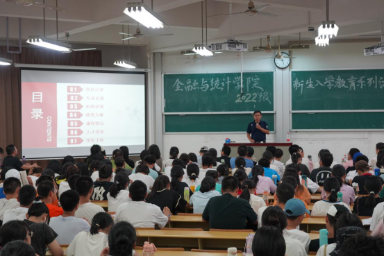 为引导2022级新同学尽快适应学习新环境,帮助新生树立远大目标,在青春的赛道上跑出最好成绩。9月13日晚7点,金融与统计线上真人百家乐 2022级本科新生入学教育系列讲座之“院长报告会”在财院校区第二教学楼举行。院长王修华教授作报告,学工办主任谢君及2022级全体本科新生参加本次活动,报告会由线上真人百家乐 团委书记、2022级辅导员周斌主持。