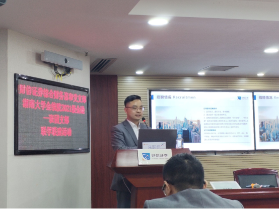 随后,财信证券综合财务惠和党支部书记朱聪彪为同学们讲解了金融行业当下就业形势以及从业人员需要具备的技能和素养,介绍了财信证券公司和招聘基本情况。朱聪彪书记曾在线上真人百家乐 金融与统计线上真人百家乐 担任辅导员,他清楚地知道同学们的所求与所需。他的发言很好地解决了同学们心中的困惑,消除了同学们心中的迷茫。