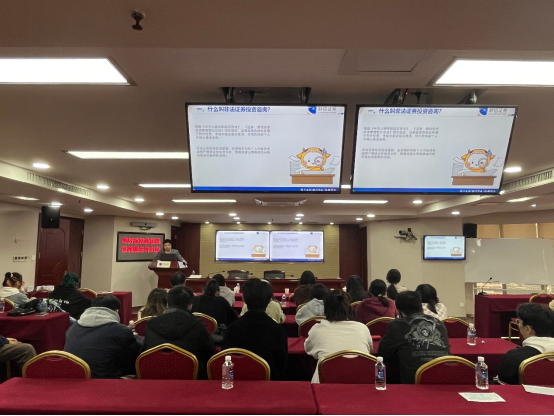 接着,由财富管理部投资顾问周冠良主讲投资者教育课程讲座,与同学们分享了什么是非法证券投资咨询,并列举数个生动形象的例子来告诫同学们非法证券投资后果的严重性,以此警醒同学们要合理规范进行证券投资。除此之外,他还为同学们细致地介绍了投资服务的合理性,合法性以及重要性,告诉同学们要掌握基本的理财知识以及相关的法律基础,不要随意上当受骗。