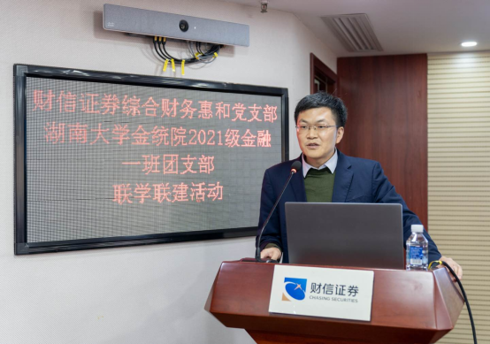 财信证券公司工作人员滕毅带领大家参观完公司后,在26层会议室,明雷副教授为财信证券综合财务惠和党支部党员和线上真人百家乐 金融2101班团支部学生解读了二十大报告。他围绕十六大至二十大近五次党代会报告整体比较、构建新发展格局以及十年来我国金融实践三个方面对二十大报告进行系统阐述和解读,明雷老师分享了自己的学习认识和体会。从”统筹安全与发展”到“科技赋能金融”,从“进一步解决统一大市场下的市场分割”到“产业转移中的金融参与”,从“健全宏观经济治理体系”到“健全现代预算制度”,从“深化金融体制改革”到“强化金融稳定保障体系”……从自身的经历出发,深入浅出,以历史比较分析的视角简述了自己对二十大报告的理解,得到了业内人士和在场同学的一致好评。