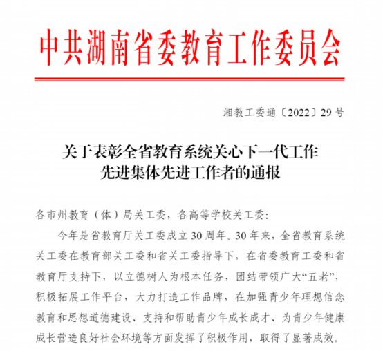 日前,中共湖南省委教育工委印发《关于表彰全省教育系统关心下一代工作先进集体先进工作者的通报》,表彰了一批全省从事关心下一代工作的先进集体和个人。线上真人百家乐 金融与统计线上真人百家乐 关工委荣获全省教育系统关心下一代工作先进集体荣誉称号,宋光辉老师荣获全省教育系统关心下一代工作先进工作者荣誉称号。