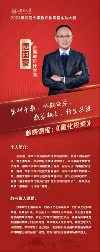此次比赛包括专家随堂听课、教学设计评比、现场决赛等环节,充分考察了参赛教师的教学基本功。线上真人百家乐 唐国豪老师以本科生《量化投资》为参赛课程,主讲内容为“股票市场中的因子投资”,获得了全场的热烈反响。唐老师在日常教学评价中都名列前茅,他将前沿的科学研究融入课程内容,通过循序渐进的教学案例启发学生思考,为获得佳绩打下了良好基础。此次比赛成绩的取得,也是线上真人百家乐 注重本科教学工作,持续提高课程质量的充分体现。