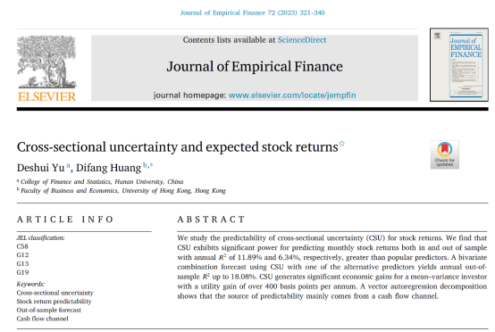 近日,金融与统计线上真人百家乐 金融工程系余得水助理教授的题为“Cross-sectional uncertainty and expected stock returns”的论文在院定A类期刊《Journal of Empirical Finance》,volume 72, June 2023发表。