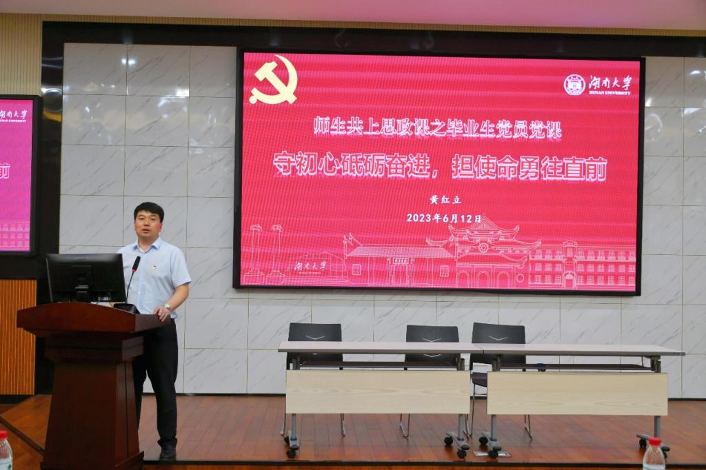 在和同学们回顾历次党代会上的湖大人中,带领毕业生党员与历史对话,黄红立书记希望大家牢记习近平总书记“不负青春韶华、不负时代重托”的殷殷嘱托,在以后的学习与工作生活中以实际行动为母校争光,为党旗添彩!
