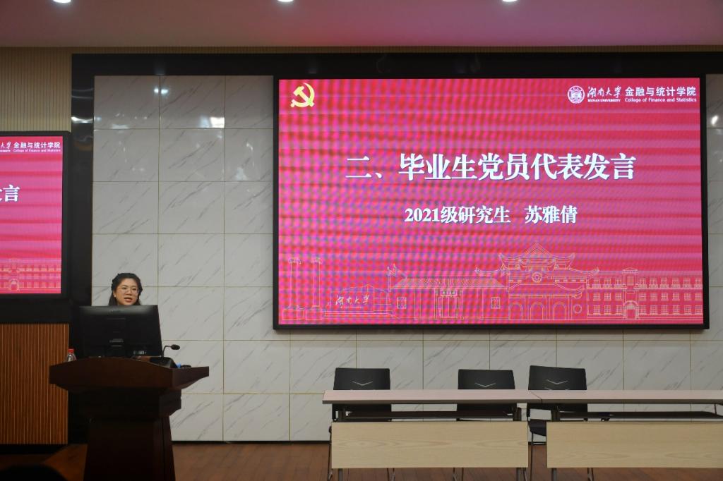 毕业生党员代表苏雅倩同学在发言中表示:在聆听黄书记的党课后,我受益匪浅。在启程新篇章之际,她向所有毕业生发出倡议:“夯理论之果,筑思想阵地”“感师恩永沐,固守初心路”“铭党员身份,肩使命长存”,希望同为毕业生的大家能够共同努力,不负青春、不负韶华、不负时代,走好人生道路。