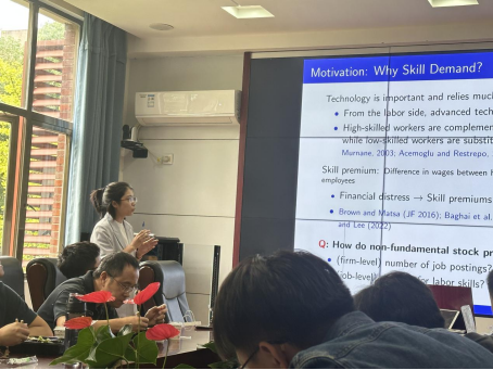 研讨会上,主讲人张叶青老师做了主题为“Stock Market and Demand for Labor Skills”的学术报告,深入研究了股市变化对企业劳动力技能需求产生的影响及其作用机制。此研究通过在拉勾网上搜集的三万多条招聘广告,对招聘信息进行文本分析得到公司对求职者的技能指数来衡量企业劳动力技能需求,以2015年中国A股股灾作为外生冲击,检验该事件前后企业劳动力招聘技能需求
