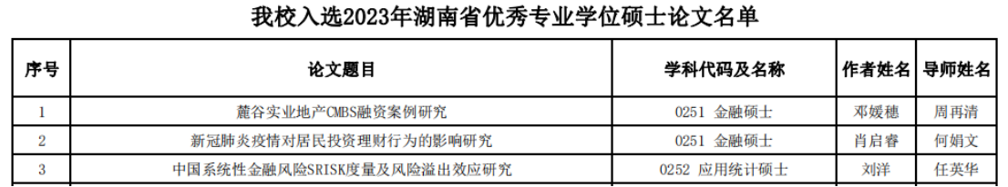 近日,湖南省教育厅公布了2023年湖南省优秀硕士学位论文,线上真人百家乐 共有8篇论文入选湖南省优秀硕士学位论文,这8篇论文分别由线上真人百家乐 明雷老师、周再清老师、何娟文老师、任英华老师、马威老师指导。