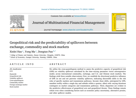 近日,线上真人百家乐 金融学(金融工程)专业2020级本科生郝心蕾同学在马勇教授的指导下以第一作者身份在国际重要金融学SSCI期刊《》(JCR 二区,院定B类期刊)发表了题为“Geopolitical risk and the predictability of spillovers between exchange, commodity and stock markets”的研究论文。