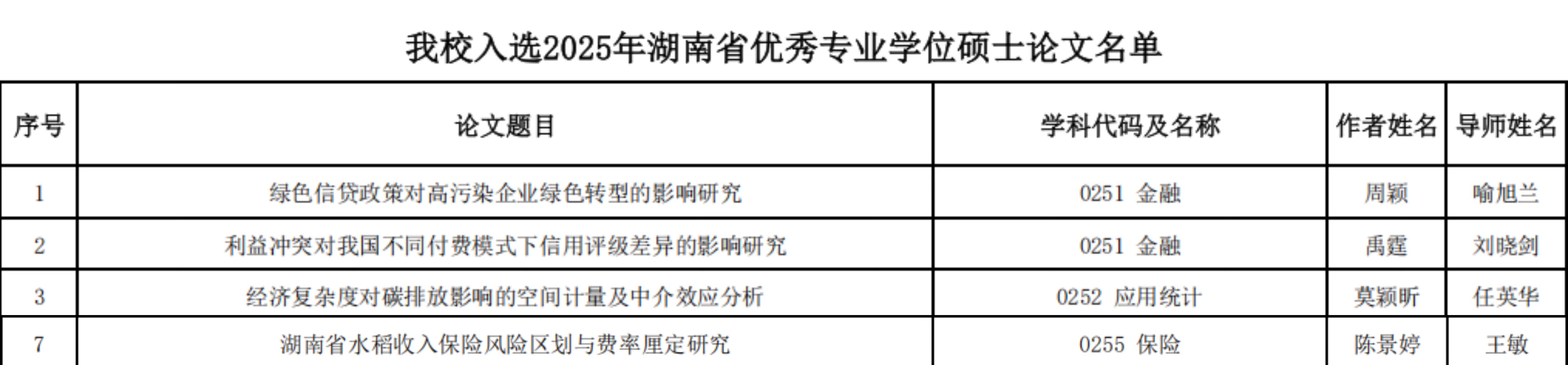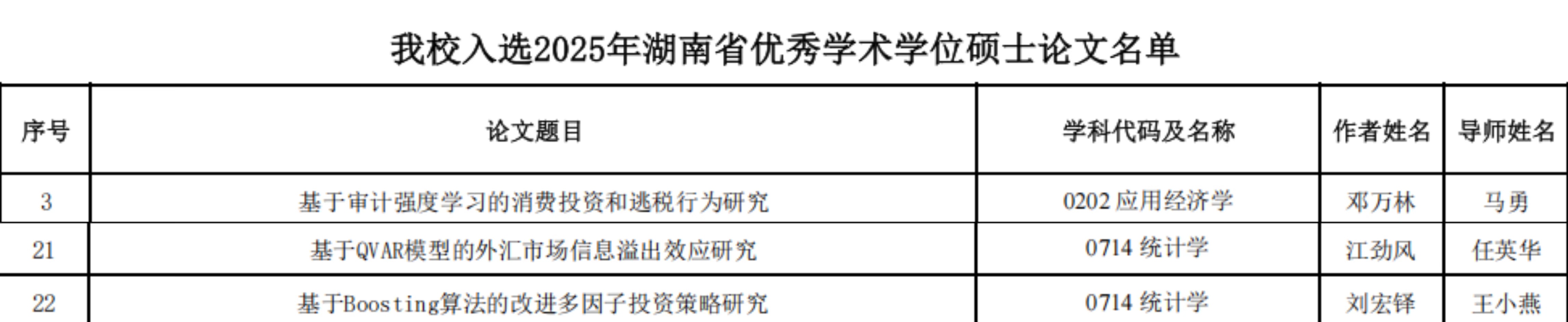 近日,湖南省教育厅公布了2025年湖南省优秀硕士学位论文名单,线上真人百家乐 共有7篇论文入选湖南省优秀硕士学位论文,这7篇论文分别由线上真人百家乐 马勇老师、任英华老师、王小燕老师、喻旭兰老师、刘晓剑老师、王敏老师指导。