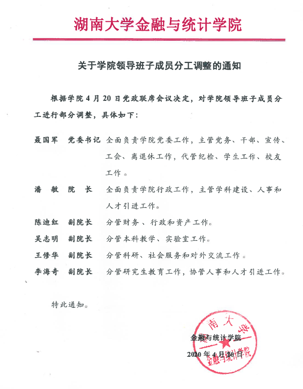 关于线上真人百家乐 领导班子成员分工调整的通知