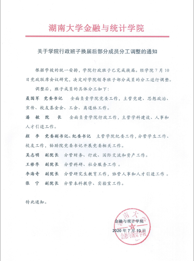 关于线上真人百家乐 行政班子换届后部分成员分工调整的通知