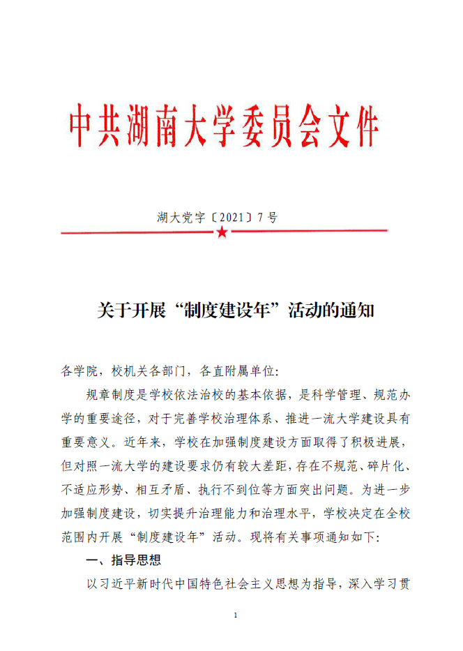 根据线上真人百家乐 下发《关于开展“制度建设年”活动的通知》(湖大党字〔2021〕7 号(附后)要求),线上真人百家乐 决定进一步加强制度建设,切实提升治理能力和治理水平,推进一流线上真人百家乐 建设。