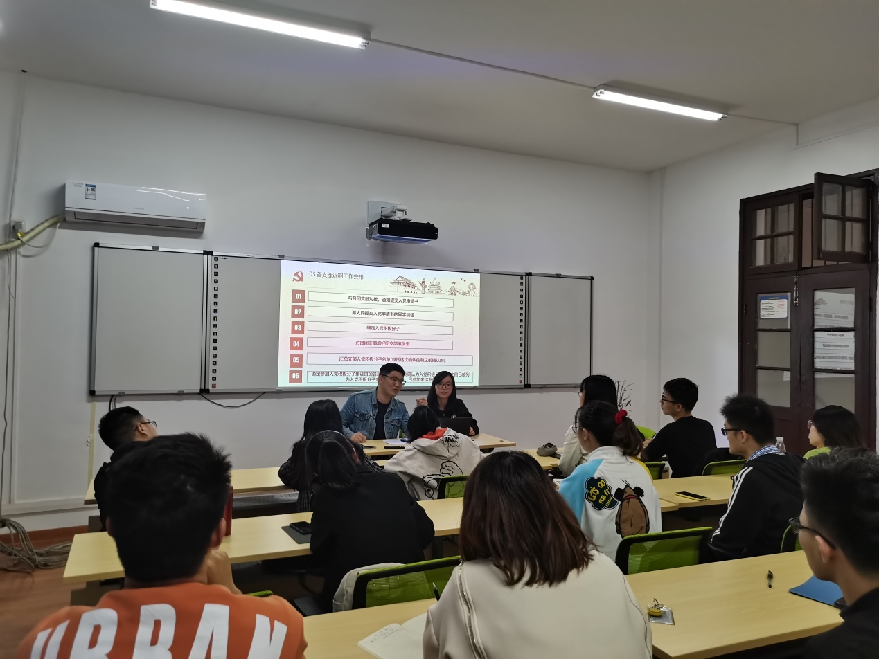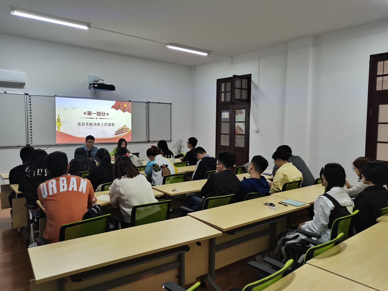 本次会议旨在吸纳优秀同学进入党组织,壮大党组织队伍,为各党支部未来的发展打下坚实基础。会议开始,汪宇涛同志从党员发展时间节点、党员发展流程以及党员发展的后续工作三个方面对党员发展工作进行了部署,强调发展党员必须坚持“经过党支部,坚持个别吸收”的原则,要严格依照“控制总量、优化结构、提高质量、发挥作用”的总要求,坚持党章规定的党员标准,把全面从严治党要求贯穿于发展党员工作的各方面、全过程。接着,邓晨露同志从入党积极分子动员、申请入党流程以及入党积极分子的确定与培养教育三个方面对积极分子吸收工作进行了安排,提出要把好入党申请关、入党推优关、积极分子培养考察关。最后,肖启睿同志对各党支部的所提问题进行答疑解惑。
