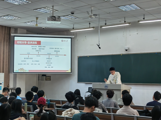 培训会邀请2023年广东朋辈招生组组长陈语乐同学作经验分享。他从活动环节、注意事项、宣讲创新形式等要点,交流了自身宣讲时的经验、技巧与心得体会。