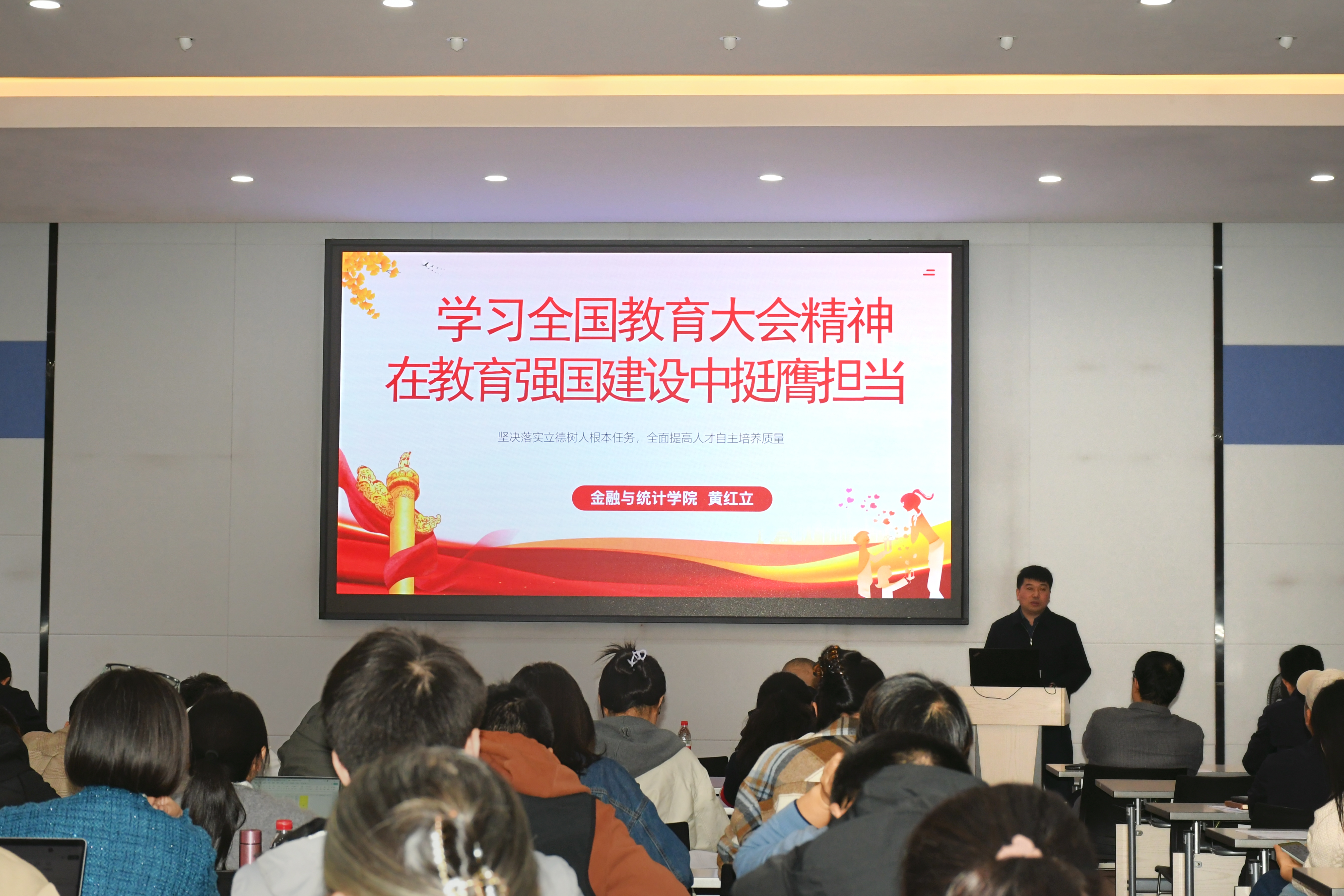 随后,线上真人百家乐 党委书记黄红立为全体教职工传达全国教育大会精神。黄红立指出,习近平总书记在全国教育大会上的重要讲话深入分析了建设教育强国的实践基础、面临形势,系统阐释教育强国的科学内涵基本路径和重大任务举措,具有很强的政治性、思想性、指导性。线上真人百家乐 教职工要在教育家精神的引领下,将全国教育大会精神贯彻落实到日常教学、科研和管理工作中,牢记为党育人、为国育才的初心使命,树立“躬耕教坛、强国有我”的志向和抱负,为培养经世致用的金统领军人才贡献智慧与力量。
