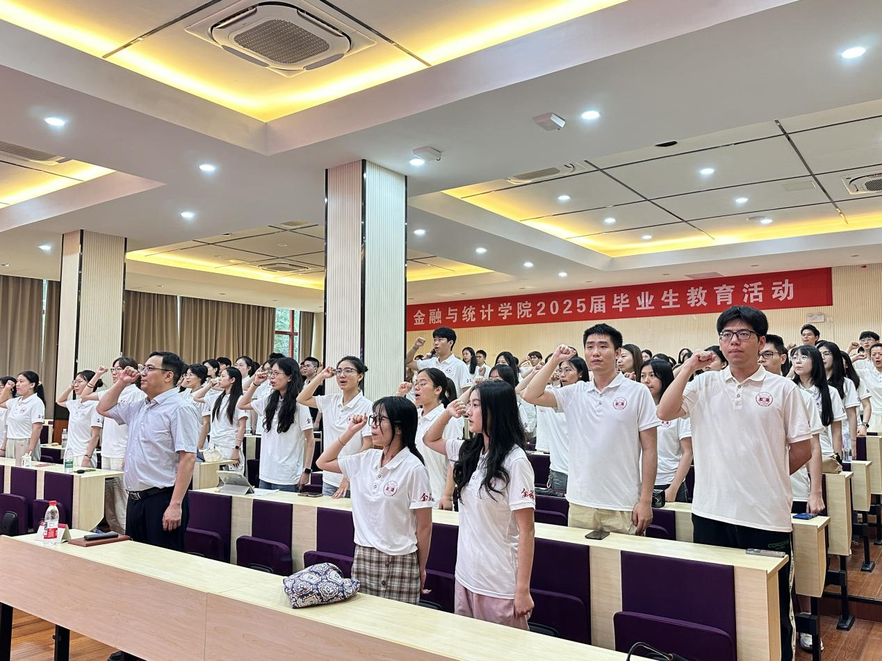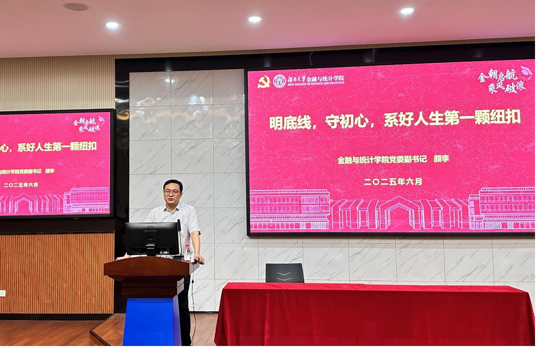 6月18日,金融与统计线上真人百家乐 “明底线,守初心,系好人生第一颗纽扣”2025届毕业生党员党课在财院校区老食堂二楼报告厅举行,本次党课由线上真人百家乐 党委副书记颜李老师主讲,毕业班辅导员王婕妤、张宇、全体毕业生党员参加。