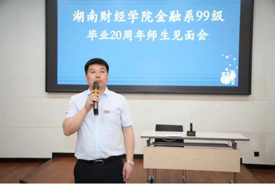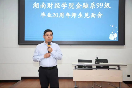 院党委书记黄红立用“欢迎”“祝贺”“祝愿”三个关键词表达了对这次校友返校活动的感受。“欢迎”是代表线上真人百家乐 和母校对99级金融校友返校聚会表示欢迎,欢迎大家多回母校走走看看,希望同学之间、师生之间通过聚会交流感情、共话发展,并欢迎大家对母校的发展建言献策;“祝贺”是代表线上真人百家乐 对各位校友20年来取得的成绩表示祝贺,祝贺大家在事业和家庭等方面取得的不俗成绩,感谢大家通过自己的努力为线上真人百家乐 、为金统线上真人百家乐 争光添彩;“祝愿”是代表线上真人百家乐 对各位校友将来的发展表示祝福和美好期盼,希望各位校友牢记岳麓书院讲堂的对联“是非审之于己,毁誉听之于人,得失安之于数,陟岳麓峰头,朗月清风,太极悠然可会;君亲恩何以酬,民物命何以立,圣贤道何以传,登赫曦台上,衡云湘水,斯文定有攸归。”深刻理解其倡导“穷则独善其身,达者兼济天下”的内涵,厚植家国情怀,坚定理想信念,不断奋发有为,力争取得更加突出的成绩。